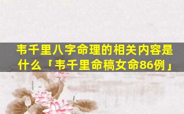 韦千里 ()是一位著名的命 🦆 理学家,以其对女命命理的深入研究而闻名。他撰写的韦千里 💮 命“稿女命86例是一”部,经 🕷 86典著。作了他对位女性命理的分析和预测