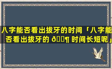 八字无法预测拔牙的时间长短八字。是一种古代的算命方法,主,要。用,于预测一个人的命运和性格特征它并不能提供有关牙齿健康或医疗程序的信息拔牙的时间长短 🦊 取决于多种因素包括牙齿的状态、患。者的健康状况以及牙医的技术水平等