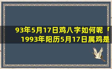 总体评价:93年5月17日鸡八字五行偏旺,整体运势一般。财,运旺,盛。事,业,运势。较好但是健康和感情方面需要注意性格上比较善于交际思维敏捷但也有冲动和固执的一面 🐝