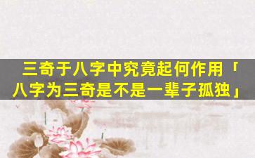 八 🦅 字中是否出现三奇并不能决定一个人的孤独程度。影响孤独感的因 🐕 素有很 🐶 多,例如性格、经、历。社会交往能力等