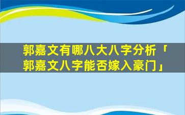 从八字上来 🌷 看,郭,嘉 🐶 文偏财旺盛容易遇 🐼 到富裕的人。但,日。坐伤官又克制正官表示她的婚姻运势不稳定