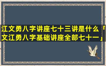 江文勇八字讲座七十三讲是一部关于八字命理学的讲座视频,由江文勇 🦁 ,老师主讲内容包括:
