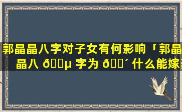 综合来看,郭晶晶的八字对子女的影响 🌵 总体中等偏上子女。可能会有较强的独立性、创,造。力,但。也要注意生育能力和子女缘分子女 🐒 运势会有起伏变动需要付出一定努力才能得到改善