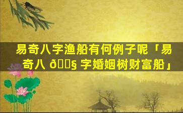 易奇八 🍁 字渔船是一 🐅 种用八字卦象推算船隻吉凶的技術。其原理是透過觀察船隻出港的日期、時辰和坐向,並,結。合船主八字來預測船隻航行的安全性和收穫以下是幾個易奇八字渔船的例子: