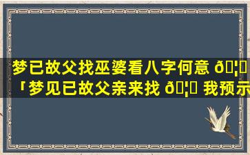 寻求指引:八 🦆 字是一种算命术,梦,中父亲找巫婆看八字可能暗示你正在寻求指引或解决方案而你认为已故父亲可以为你提供 🐕 帮助。