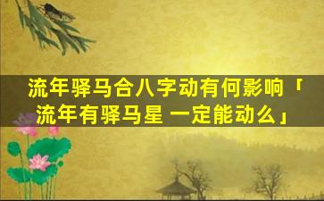 流年驿马合八字动是指 🐦 当前流年的大运遇到八字中 🦄 的驿马星而发生关联驿马星。代表着旅 🐠 行、变动、奔。波当流年驿马合八字动时,预、示。着该年将会有较多的出行变动或奔波