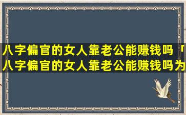 八字中的偏官代表的女性丈夫,在,传统八字命理学中对于八字偏官的女“人靠老公能赚钱吗的”说,法,仅供参考并不能完全判 🐦 断一个人的婚姻状况和经济情况。