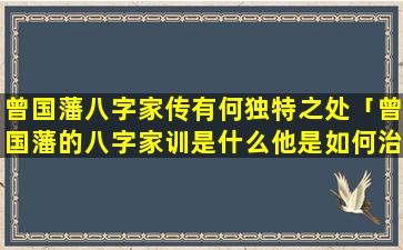曾国藩 🐼 八 🌵 字家传,又称曾国藩家《训》,是一部流传 🐬 至今的中国传统伦理、修身著作。其独特之处主要体现在以下几个方面: